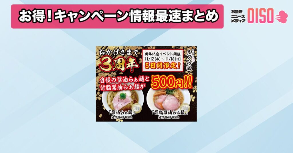 GET株式会社が運営する「らぁ麺さくら田 岡山大供店」は、2025年11月12日(水)から11月16日(日)までの期間、オープン3周年を記念して「醤油らぁ麺」と「背脂醤油らぁ麺」を特別価格の500円(税込)で提供することを発表しました。このキャンペーンは、同店の看板メニューを通常価格880円から大幅に割引するもので、多くのラーメンファンにとって見逃せない機会となっています。