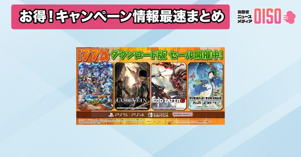 株式会社バンダイナムコエンターテインメントは、2025年11月5日(水)から11月21日(金)までの期間に、ダウンロード版ゲームをお得に購入できるセールを開催することを発表しました。このセールでは、人気タイトルが多数ラインナップされており、特に『CODE VEIN デラックスエディション』は驚きの75%OFFという大幅な割引が適用されています。
