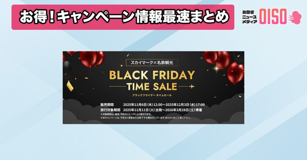 名鉄観光サービス株式会社は、2025年11月6日から12月3日までの期間限定で、スカイマークを利用した国内旅行のダイナミックパッケージ商品を対象としたタイムセールを開始することを発表しました。このセールでは、特別イベント「BLACK FRIDAY(ブラックフライデー)」を名鉄観光サービスの国内旅行として初めて開催し、魅力的な旅行先を特別価格で提供します。