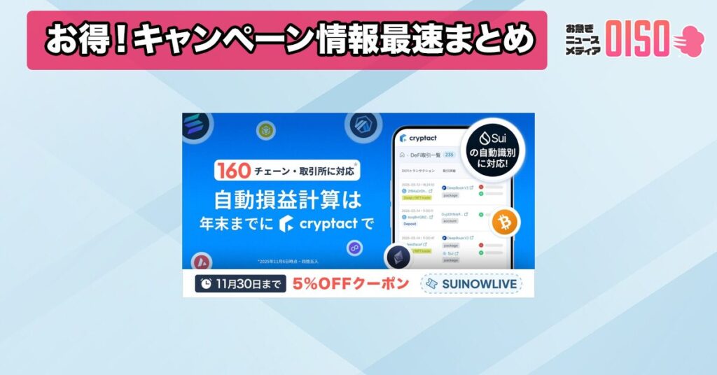 今回のSuiブロックチェーン対応を記念して、クリプタクトは5%OFFクーポンを配布することを発表した。クーポンコード「SUINOWLIVE」を使用することで、誰でも利用可能だ。クーポンの利用期間は2025年11月6日から11月30日までとなっており、新規購入やプランのアップグレード時に適用可能である。