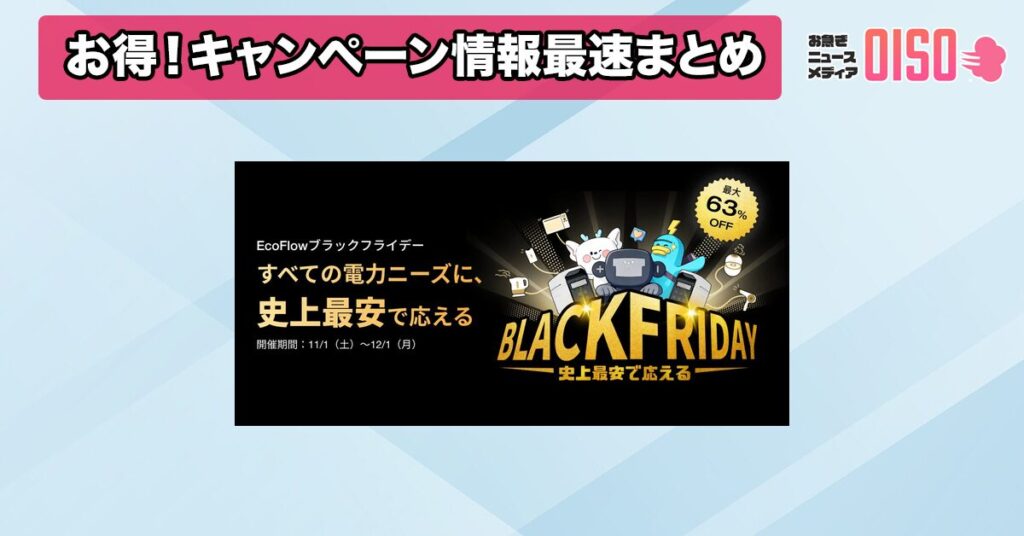 ポータブル電源とクリーンエネルギー技術のリーディングカンパニーであるEcoFlow Technology Japan株式会社が、2025年11月6日(木)から12月1日(月)までの期間に、Amazonブラックフライデーに合わせて「EcoFlowブラックフライデー」セールを開催することを発表した。このセールでは、人気商品が最大63%OFFで提供されるほか、世界最小・最軽量の新製品も登場する。