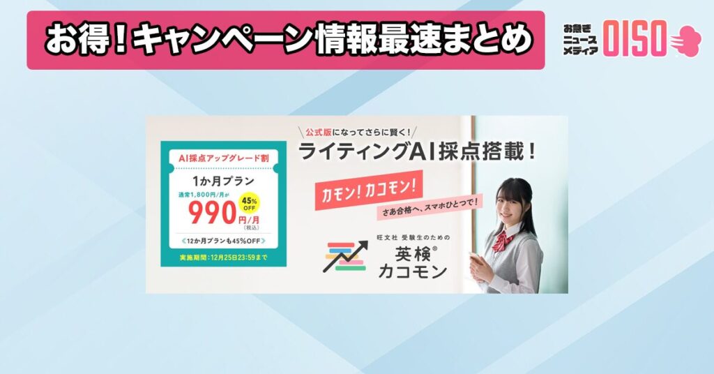 教育出版社の株式会社旺文社は、実用英語技能検定(英検)の過去問学習ができるwebサービス「受験生のための英検®カコモン」に新たにライティングAI採点公式版を搭載したことを記念し、特別キャンペーンを開催することを発表した。このキャンペーンは、2025年12月25日までの期間限定で、特に受験生にとってお得なプランを提供するものとなっている。
