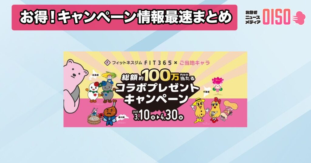 株式会社ヤマウチが運営するフィットネスジム「FIT365」は、3月10日から4月30日までの期間限定で、ご当地キャラクターとのコラボレーションキャンペーンを実施することを発表した。このキャンペーンでは、FIT365のオリジナルキャラクター「ももクマ」と、北海道、千葉県、香川県のご当地キャラクターが共演する特別なポスターを全国のFIT365店舗に掲示する。