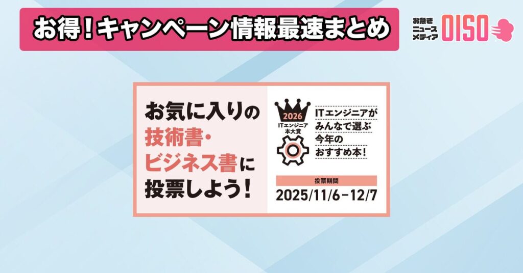 株式会社翔泳社が主催する「ITエンジニア本大賞2026」が、2025年11月6日(木)よりITエンジニアが選ぶおすすめの技術書とビジネス書に関するWeb投票を開始することを発表した。このイベントは、ITエンジニアが自身の経験に基づいて、他のエンジニアに読んでほしい書籍を選ぶもので、2014年から毎年開催されており、今年で13回目の開催となる。
