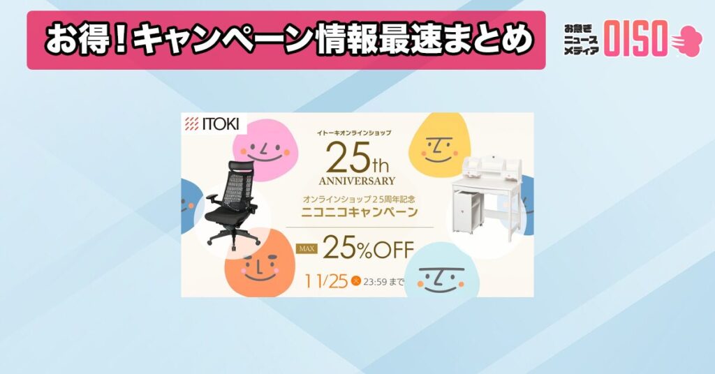 株式会社イトーキは、2000年に開始したECでのオンライン販売が2025年11月で25周年を迎えることを発表した。この特別な節目を記念して、同社は「オンラインショップ25周年記念 ニコニコキャンペーン」を開催し、人気商品が最大25%OFFで提供されることになった。