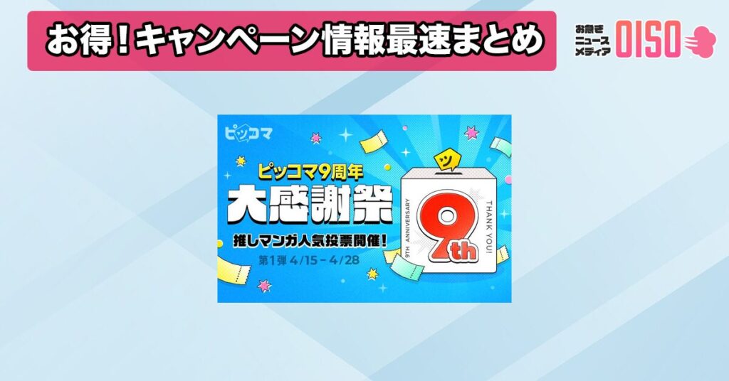 株式会社カカオピッコマが運営する電子マンガ・ノベルサービス「ピッコマ」は、4月20日に9周年を迎えるにあたり、4月15日から「9周年大感謝祭イベント」を開催することを発表した。このイベントでは、ユーザーが楽しめる様々な企画が用意されており、多くのファンが参加することが期待されている。