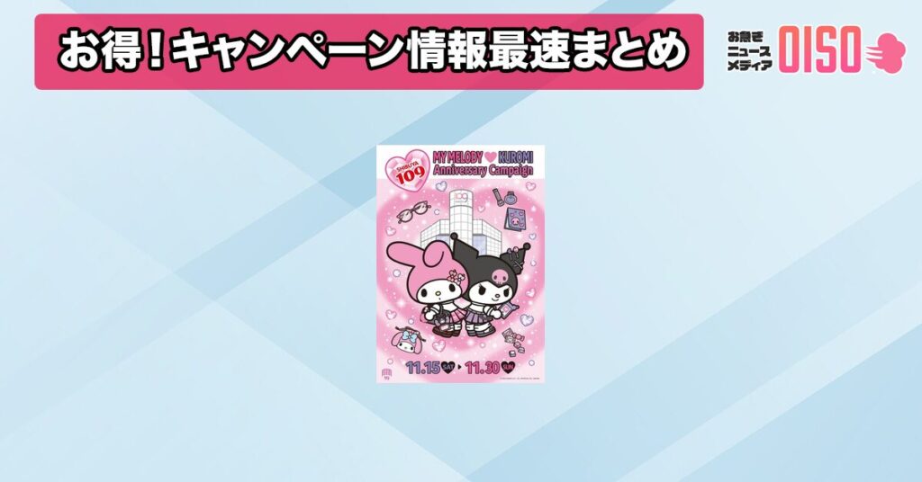 株式会社SHIBUYA109エンタテイメントは、2025年11月15日(土)から11月30日(日)まで、東京・渋谷の「SHIBUYA109渋谷店」にて「マイメロディ」50周年と「クロミ」20周年を祝う『SHIBUYA109 × MY MELODY ♡ KUROMI Anniversary Campaign』を開催する。このキャンペーンでは、オリジナルコラボアイテムの先行販売や豪華ノベルティの配布、特設フォトスポットの設置など、多彩なイベントが展開される。
