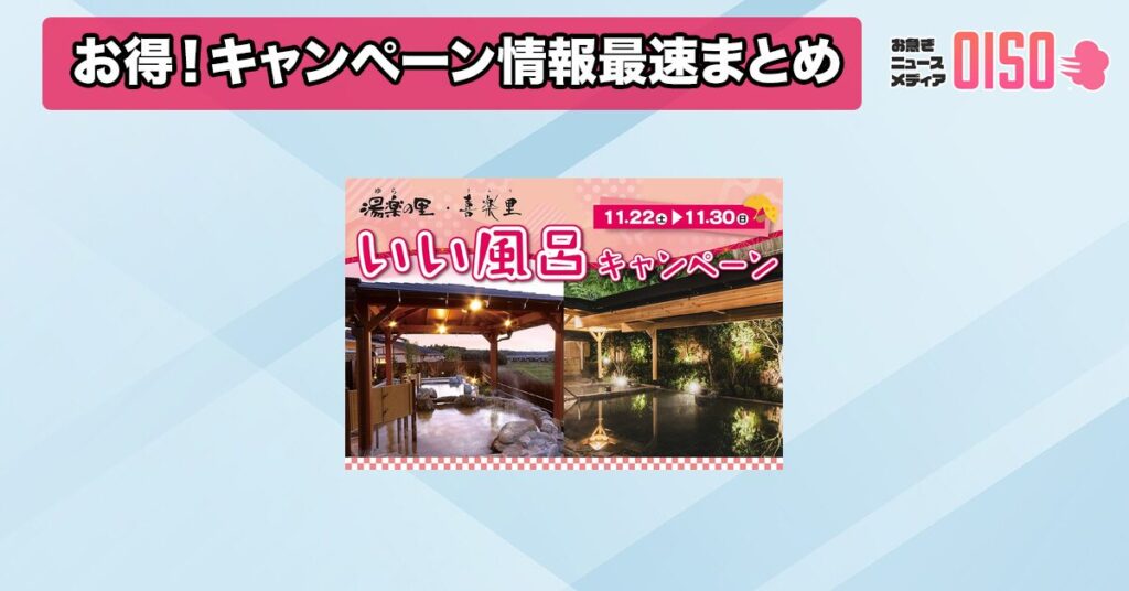 株式会社スパサンフジが運営する日帰り温浴施設「湯楽の里」と「喜楽里」は、11月26日の「いい風呂の日」に合わせて、特別なイベント「いい風呂キャンペーン」を実施することを発表しました。このキャンペーンは、2025年11月22日から11月30日までの期間中、首都圏にある全22店舗で楽しむことができます。