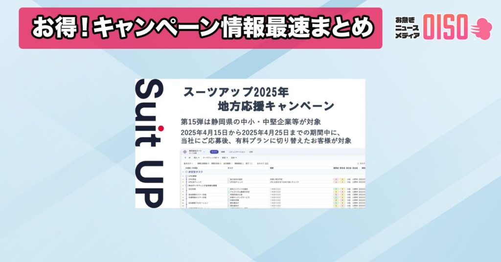 株式会社スーツが発表した「スーツアップ2025年地方応援キャンペーン」第15弾は、静岡県の中小企業やスタートアップを対象にした特別な割引キャンペーンです。このキャンペーンは、2025年4月15日から4月25日までの期間中に実施され、社員数100名未満の企業に向けて、経営支援クラウド「Suit UP」の有料プランを20%割引で提供します。