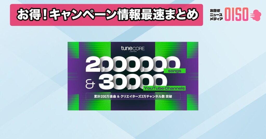 TuneCore Japanは、配信楽曲200万曲突破とクリエイターズYouTubeチャンネル数3万達成を記念し、期間限定でシングル1曲配信を無料で行うキャンペーンを実施する。対象はTuneCore Japanアカウントを持つユーザーで、新規アカウントの登録も可能だ。キャンペーンは2025年11月5日から11月18日までの期間限定で、シングル配信の1年間利用料が無料となる。