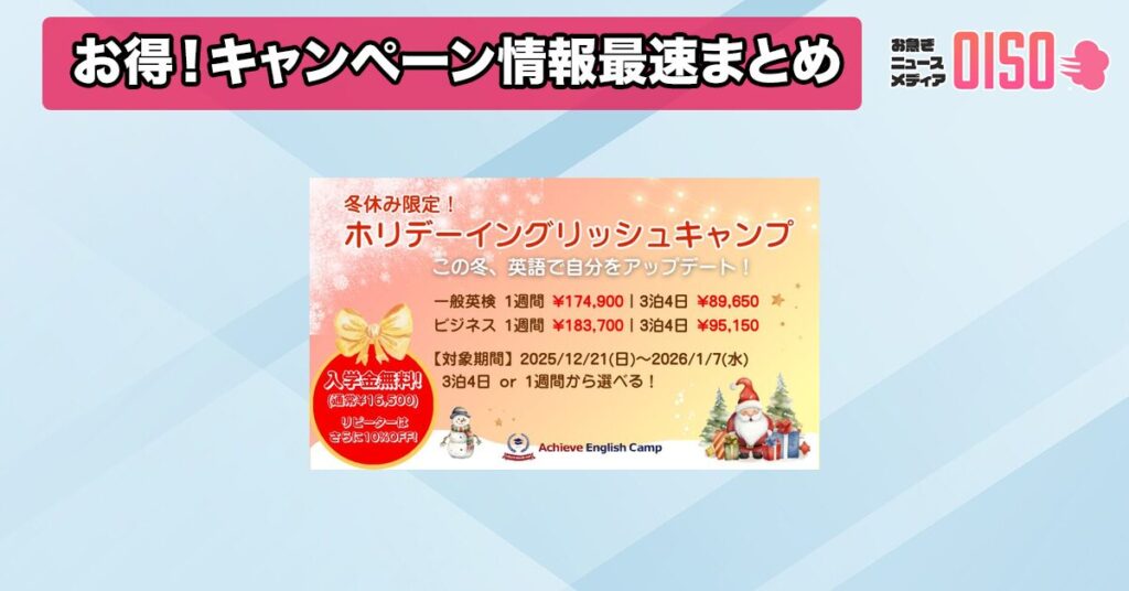 今回の冬休みプランの募集開始を記念して、特別キャンペーンが実施される。先着30名様には、入学金(16,500円)が全額無料となる特典が用意されている。加えて、リピーター特典として参加費が10%OFFになるほか、友達紹介割もあり、1名紹介ごとに最大1万円の割引が受けられる。