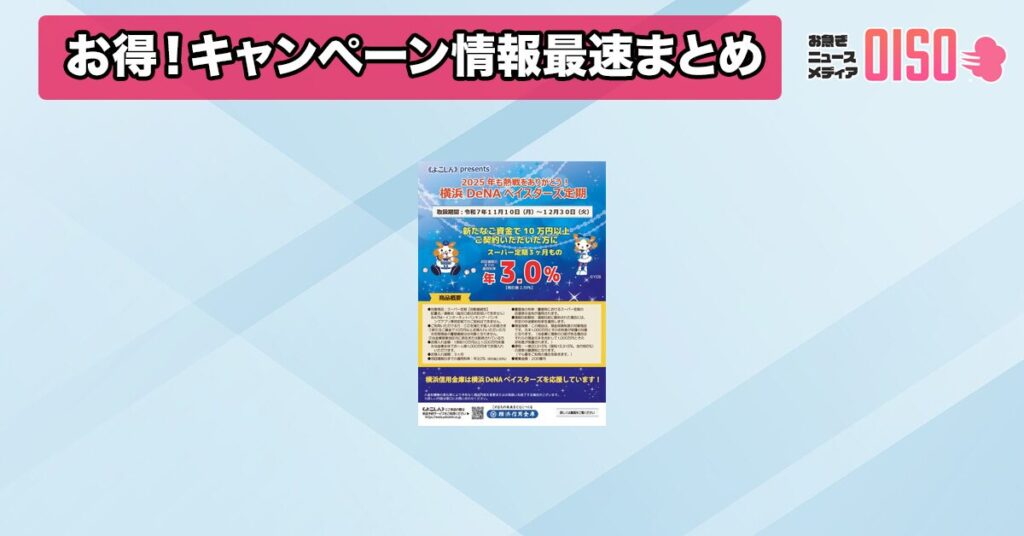 横浜信用金庫は、横浜DeNAベイスターズの2025年の熱戦を称える「2025年も熱戦をありがとう!横浜DeNAベイスターズ定期」の取扱いを開始することを発表しました。この定期預金は、期間中に新たに10万円以上を預入れた個人のお客様を対象とし、特別な金利が適用されます。
