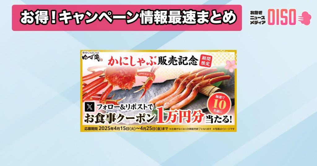 株式会社物語コーポレーションが展開する「寿司・しゃぶしゃぶ ゆず庵」は、「本ずわいがに かにしゃぶ」の販売を記念して、公式X(旧Twitter)でのプレゼントキャンペーンを発表した。このキャンペーンでは、合計10名に「ゆず庵アプリクーポン10,000円分」が当たるチャンスがある。参加方法は簡単で、公式アカウントをフォローし、特定の投稿をリポストするだけだ。